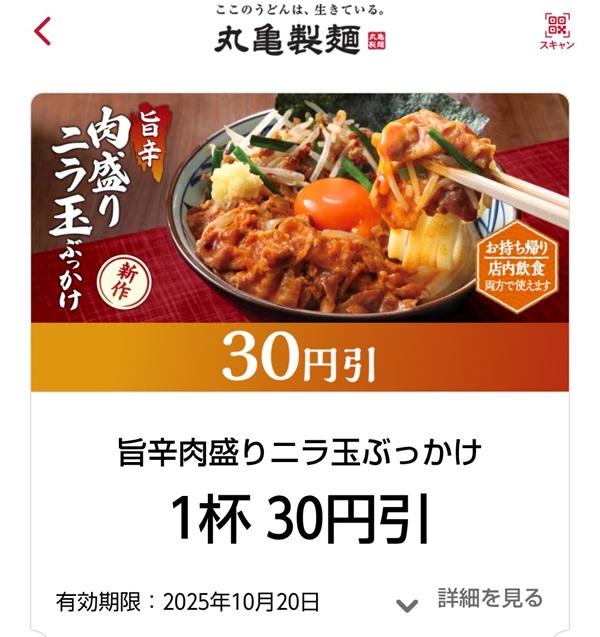 ▼丸亀製麵アプリで旨辛 肉盛りニラ玉ぶっかけうどん30円引クーポンが配信されています。