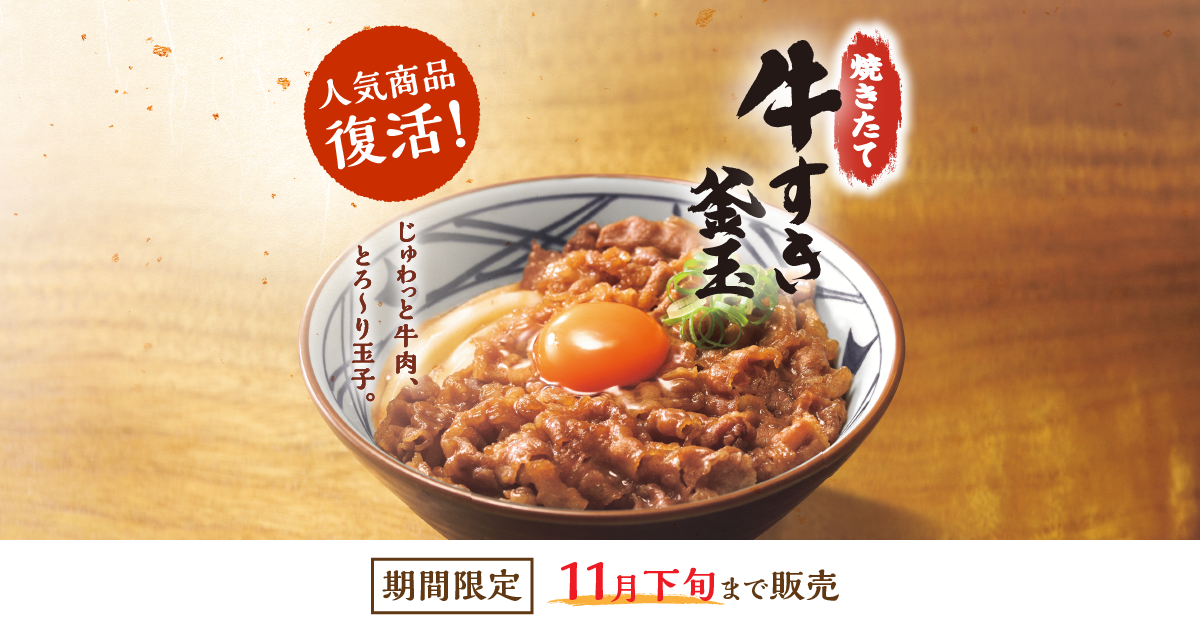 登場以来「定番メニュー化してほしい」というお声を多数いただくほど大人気の『焼きたて牛すき釜玉うどん』が期間限定で販売中です。釜から直接すくいあげて、水で締めずにご提供する「釜抜き麺」は、牛すき焼きの旨みと甘みがよく染み込み、さらに玉子をからめることで三位一体のおいしさがお楽しみいただけます。 焼きたて牛すき釜玉うどん|ここのうどんは、生きている。丸亀製麺打ち立てのうどんに焼きたてのじゅわっと牛肉、玉子をからめてうまい「焼きたて牛すき釜玉うどん」が期間限定の復活です。