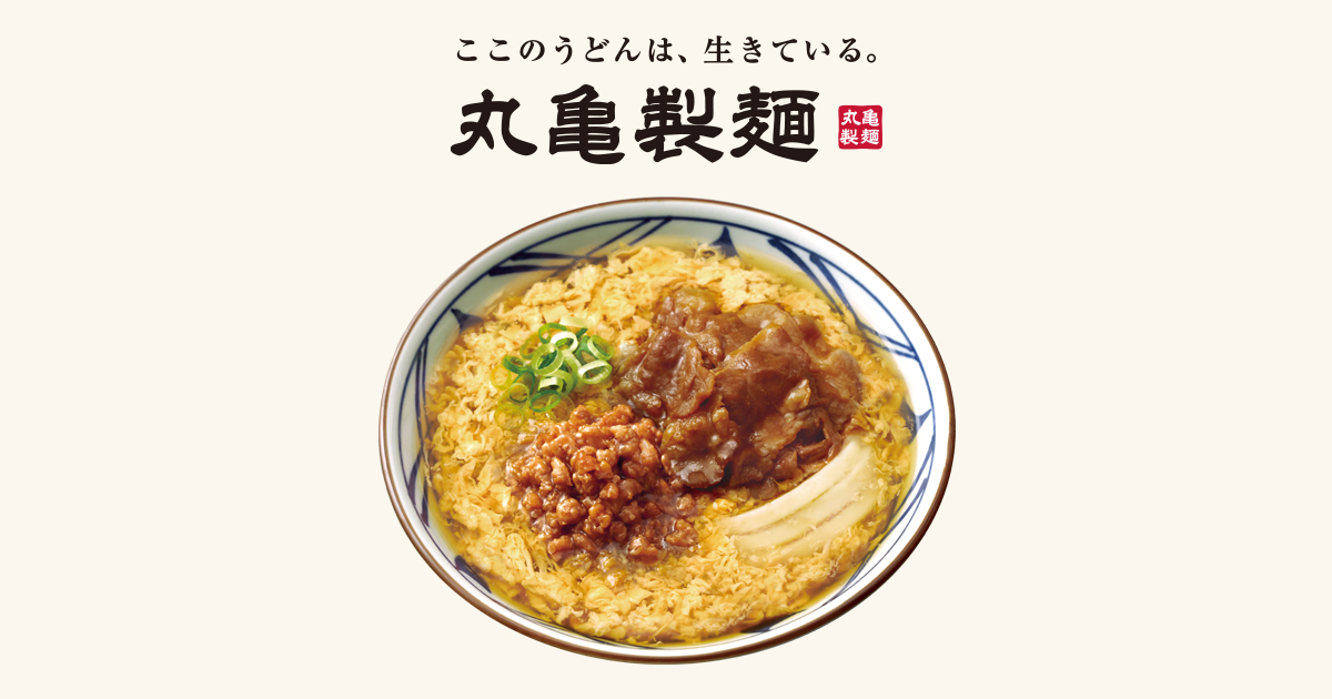 少し甘めに味付けした牛肉は、とろみをまとわせて肉汁を閉じ込めました。コク深い濃厚なタレを加えた鶏肉と豚肉の合わせそぼろは、針しょうががアクセントとなり、最後まで食べ飽きないおいしさです。じゅわっと甘辛く焼き上げたお肉の濃厚な味わいが、とろりとした玉子あんかけと、ふわふわ・もちもちの釜抜き麺にたっぷり絡みます。手づくりのおいしさ重なる一杯を、ぜひお召し上がりください。 肉がさね玉子あんかけうどん|うどん|ここのうどんは、生きている。丸亀製麺丸亀製麺は全店に製麺機を置いて、打ち立て、茹でたての味を実現。 国産小麦100%にこだわった讃岐うどんのおいしさを、心ゆくまでご堪能ください。