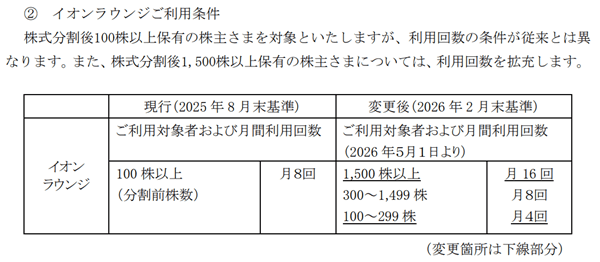 2026年2月28日を基準日とした株主名簿に記載または記録された株主さまに対する株主優待より、株式分割後の株式数に基づき、変更後の基準を適用いたします。